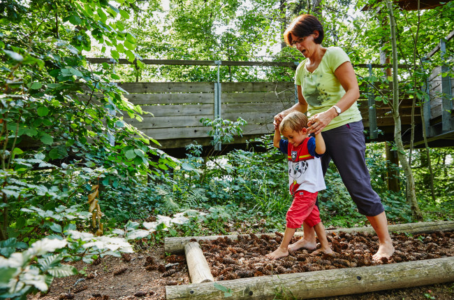 In direktem Hautkontakt mit der Natur geht es barfuß über Tannenzapfen, Hölzer, Steine, Moos und viele weitere Materialien. Uralte Sinne werden neu entdeckt.